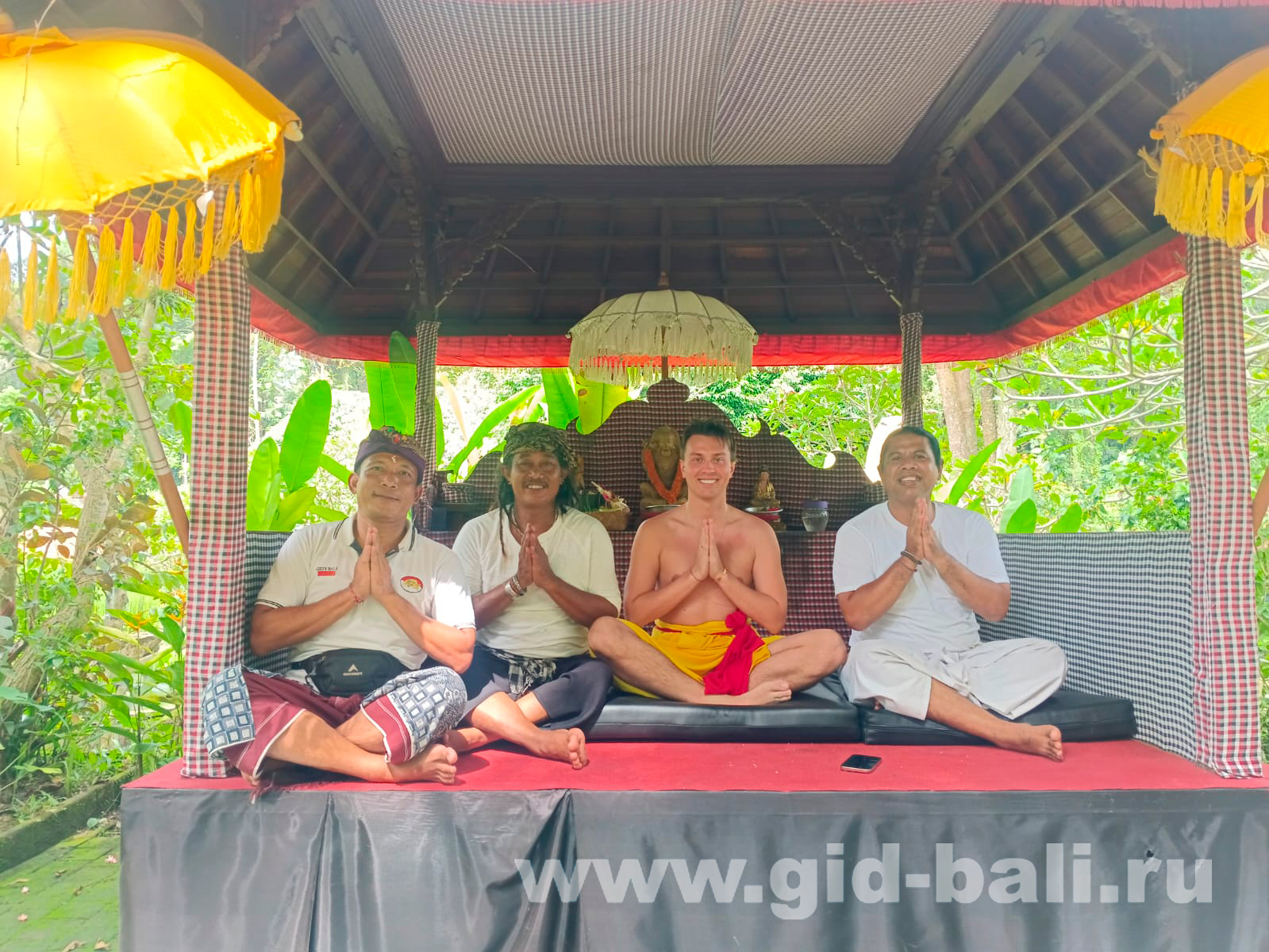 Перед началом церемонии обязательно наденьте саронг, прикройте плечи (мужчинам плечи прикрывать не нужно, это првило касается только женщин), снимите обувь и все лишние вещи (в том числе очки, головные уборы и украшения). Настройтесь морально на ритуал и откройте ему свое сердце. Кроме того, перед началом обряда омойте руки и ноги. Это обязательно нужно делать перед входом в храм или священный источник.